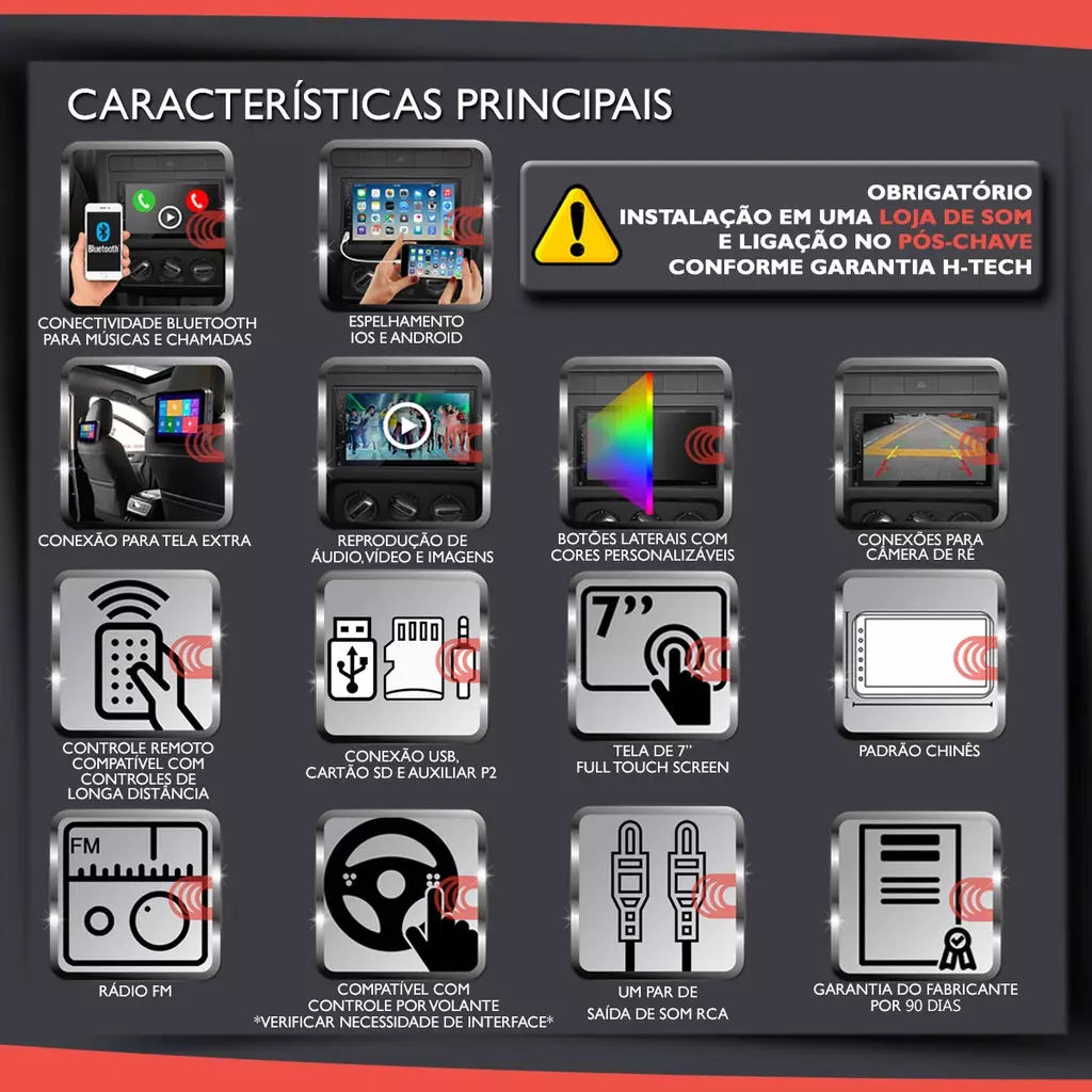 Essa multimídia tem espelhamento via cabo USB para Android e iOS, também reproduz vídeos e músicas, possui Bluetooth, Rádio FM, controle remoto e entrada para USB, Cartão SD e Auxiliar P2.